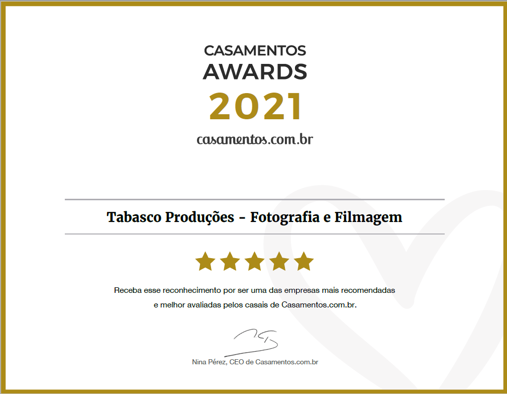 Nossas avaliações, com nota máxima nos portais como Facebook, Casamentos.com.br e Zankyou, são reflexo do nosso comprometimento com a satisfação dos clientes. Além disso, somos ganhadores dos prêmios Casamentos Awards 2021, 22, 23 e 24 na categoria de fotografia, reconhecimento do nosso trabalho excepcional.